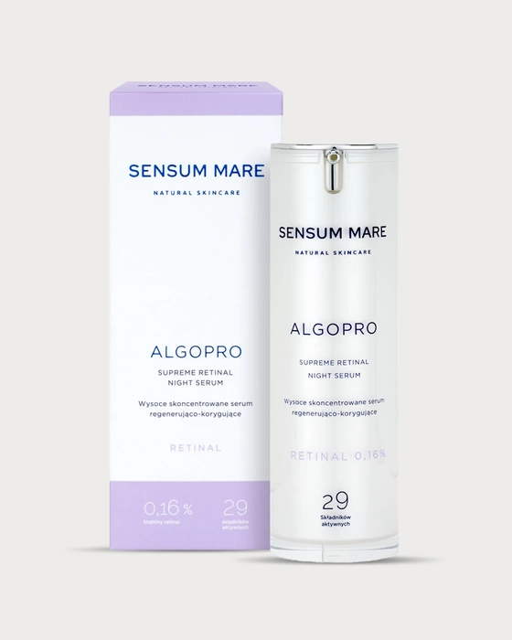 Jak należy stosować serum z retinalem?Serum stosujemy wieczorem na oczyszczoną i suchą skórę twarzy, szyi i dekoltu omijając okolice oczu i ust. Pamiętaj aby odczekać około 30 minut, następnie rekomendujemy nałożenie kremu z serii ALGORICH/ ALGOLIGHT lub maski nocnej ALGOMASK. Kurację rozpocznij od niższego stężenia – 0,08% retinalu, wprowadzaj go do pielęgnacji stopniowo. Na początku stosowania aplikuj produkt 2 razy w tygodniu, aby przygotować skórę do działania retinalu, po dwóch tygodniach możesz stosować produkt co drugi wieczór. Po zakończeniu kuracji z stężeniem 0,08% możesz przejść na wyższe stężenie 0,16%.